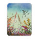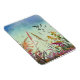 En vacker scen med levande och färgstarka vilda blommor i vinden framför ett blått och grönt himmel med stjärnor.