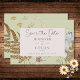 Lägg märke till bröllop med lite rustik elegans. Vårt infångande bröllop spara datum-kort har en levande arrangemang av vilda blommor och blommor, som är noggrant handritade och påminner om pressade botaniska skatter. Rik färg som solbränna, gult, kräm, blått och sage grönt framträder vackert mot en mjuk grönt bakgrund ram. Dina uppgifter om bröllop visas i en textruta med skarp kräm, vilket ger klarhet och elegans. Den här fängslande designen fångar kärnan i en vildblomma, och erbjuder ett unikt och minnesvärt sätt att fira din kärlek-berättelse. Skapat av Farmhouse Press.