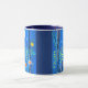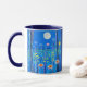 Kaffe mugg i en fantastisk scen av vilda blommor i skogen, under fullt, i nattblått och turkos