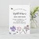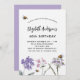 En vit bakgrund. Dekorerad med bin och målade vilda blommor i violett och rosa. Anpassa och lägg till information om namn och party.