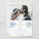 Boho, modern, elegant periwinkle-inbjudan med ett modernt kalligrafiskript, guld-rep och foto.