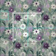 Ett slående blommönster av vilda blommor i mjuk grönt, nyans och lila.