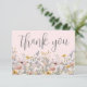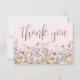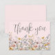 Wildflower Thank You Card. This minimalist and elegant design is perfect for bridal showers, baby showers, or anyone who loves a simple, timeless style. The front features a dusty blue or periwinkle blue background with “thank you” displayed in a graceful script font, with a row of colorful pastel watercolor wildflowers along the bottom for a soft, natural touch. The florals include blush pinks, yellows, blues, lilac purples, and soft green leaves and stems for a fresh, romantic feel.