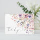 This flat thank you card is designed to match a sweet and whimsical floral theme. The front features soft watercolor wildflowers and greenery surrounding the words “Thank You” in elegant handwritten script calligraphy. The soft color palette of blush pinks, dusty rose, lilac, lavender, violet, and fresh greens adds a gentle and charming touch.