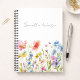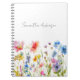 This personalized notebook features delicate watercolor wildflowers in soft pink, blue, yellow, and purple tones along the bottom, paired with an elegant script name across the clean white cover. Beautiful and practical, it’s perfect for school, office organization, teacher planning, or creating a coordinated custom stationery set. A lovely blend of feminine florals and everyday function.