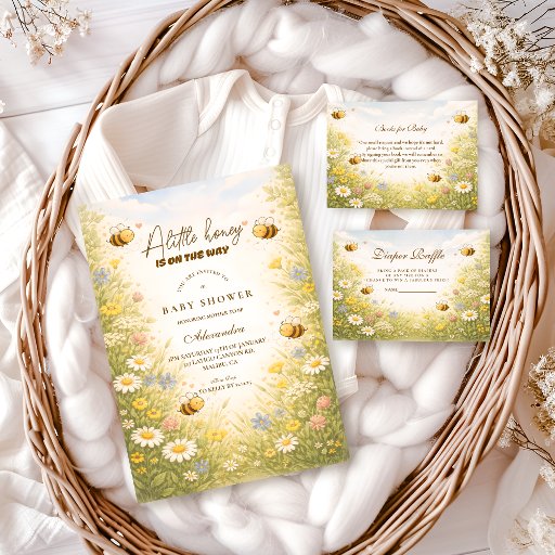 A dreamy celestial design featuring glowing stars, soft clouds, golden moons, and delicate honey bees drifting through a night-sky inspired scene. The warm honey and cream palette creates a gentle, magical atmosphere perfect for welcoming a little one. This illustrated layout blends whimsical nature elements with a soft celestial theme and can be easily personalized with your event details for a truly sweet celebration.