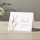 An elegant baby girl shower thank you card featuring "thank you" in a stylish pink calligraphy script, boho-inspired watercolors of dainty purple, pink and yellow wildflowers. On the inside, personalize your thank you message and add your name in a signature-like script, or leave blank for a hand-written note.