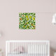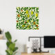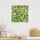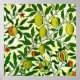 Skriv ut citroner, granatäpplen och persikor i William Morris Art nouveau med blommar på lövhaltig grenar - frukt i gult och korall orange, med grönt löv, mot en mönstrad, mönster och vit bakgrund