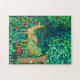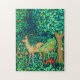 Pussel i en William Morris-tapesi-design av hjort i en fantasi-skogsmiljö - besk spräckt hjort i en lush, djup blå och grönt bakgrund av löv och blommor, accentuerad med röda tulpaner