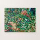 Pussel i en William Morris-tapesi-design av en räv och en fasan under flygning i en fantasi-skogsmiljö av lövsax och frukt av grönt träd