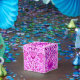 Favoritbox i vintagen William Morris mönster av hyacinter, tuliper och löv, i skuggor av violett, plommon och vitt, accinerat med djup lila och äggplanta, på en baksida av pastelllavender/lätt lila
