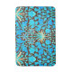Badmat i vintagen William Morris mönster av hyacinter, tuliper och löv, i skuggor av mjukt akva och cerulenblått, accentuerade med korallets rosa och orange, på en mörk av chokladbrun bakgrund