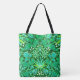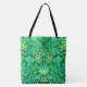 I en vintage William Morris mönster tryckt påse med hyacinter, tuliper och löv, i skugga av emerald och jade grönt, accentuerad med akva och vitt, på en djup grönt