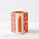 Kaffe mugg i en vintage William Morris mönster av hyacinter, tulpaner och löv, i nyanser av orange och saffran, accentuerad med vitt, på djup bakgrund av mandarin-orangen