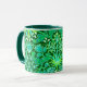 Kaffemuggen i ett vintageWilliam Morris mönster av hyacint, tulpan och löv, skuggar in av smaragd- och jadegrönt, betonat med aqua och vit, på en djup skoggröntbakgrund