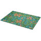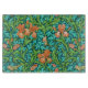 Skärbräda i ett William Morris, Art Nouveau, textiltryck av iris och blad, digitalt förbättrat och färgat, i mandarinfärgad orange, limegrön och mjuk akva på en djup turkos / teal bakgrund