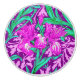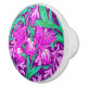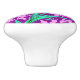 Keramisk knopp i en William Morris, Art nouveau, textilavtryck av iriser och löv, digitalt förstärkt och färgad, i mjuk orkidé och turkos, på djup ametist-lila