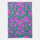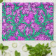 Kökshandduk i William Morris, Art nouveau, textilavtryck av irisar och löv, digitalt förstärkt och färgad, i mjuk orkidé och turkos, på djup ametyst lila