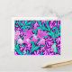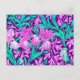 vykort i William Morris, Art nouveau, textilavtryck av irisar och löv, digitalt förstärkt och färgad, i mjuk orkidé och turkos, på djup ametist-lila