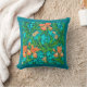 Kudde i en William Morris, art nouveau, textiltrycket av irises och löv som förhöjs och färgas digitalt, i orange, limefruktgrönt och mjuk aqua, på en djup turkosbakgrund