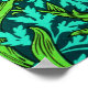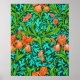 Skriv ut i en William Morris, Art nouveau, ett texturerat märke av löv, digitalt förbättrat och färgad, i orange, kalkgrönt och mjukt akvarium, på djupa turkospunsig bakgrund