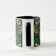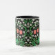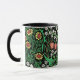 Mugg i en vintage William Morris Jacobean blommigt tapet mönster av tulpaner av korall rosa, daisy av gult, blåvioletta, ömtåliga vita blommar och blad av grönt på svart bakgrund, digitalt förbättrad och färgad