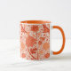 Kaffemugg i en William Morris, art nouveau, textilmönster - eleganten, stylized, chrysanthemums, solrosor och löv, i mjuk korallorange och terrakotta/rostar orangen, på en vitbakgrund