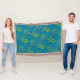 Släng i en vintage William Morris, Art nouveau, marigold damask avtryck av löv och blommor, digitalt utökad och färgad, i skalade turkoser, akvarier och koboltblått, accentuerade med gult och kalkgrönt, på en mörks blå bakgrund