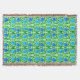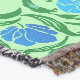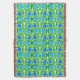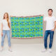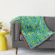 Filt i vintagen William Morris-textilier mönster av styliserade kålblommor och löv - blommor i en gradient av djup till ljusblå kerulenblått, med emerald grönt löv, på en ljusgrön bakgrund av kalk