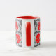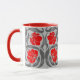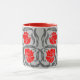 Mugg i en vintage William Morris-textilmönster av stiliserade silver av kålblommor och löv - blommor i en gradient av mörk till ljusröd, med grafitgrått/grått-löv, på en lätt grått-bakgrund