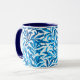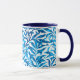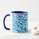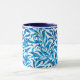 Mugg i en vintage William Morris mönster av stylized willow grenar, i skuggor av kobolt och halmblått med mörk indigo, på vit bakgrund