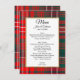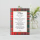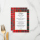 Färgfullt Menykort för höglandsbröllop som gjorts i modernt rött, blått, grönt och vitt Wilson plaid mönster. Ett vitt textområde med kanter guld, i mitten, har redo för svarttext för att anpassa sig. Matchande produkter är tillgängliga.