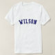 Wilson! Är ditt namn Wilson? Eller har du en make, en pojkvän, en male familjemedlem eller en manlig vännen namngav Wilson? Om så, är denna "baner" skjorta exakt gåvan som du söker efter! Designen presenterar "Wilson" i välvd marinbokstäver över bröstkorgen i klassikerhögskolastilsorten.