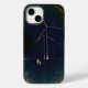 En originalteckning på ett telefonfodral. Den här teckningen har en vuxen och ett barn som går mot två stora vindkraftverk. Denna målning skapades för att beskriva klimatförändringen och kampen för att samhället ska utvecklas mot hållbara energikällor. Det är ett foto av min brorson och jag går genom ett snö täckt fält mot en kvarn i Ontario.