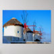 1600-talets vindkraftverk och klassiska vitvällar i byggnad ligger på Mykonos-öns labyrinthinggator i Grekland.