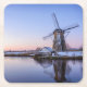 Underlägg med en soluppgång över windmillsna av Kinderdijk i Nederländerna i vinter med någon snö och is på vatten.