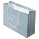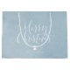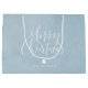 I julklappar i personlig finns det vita, handskrivna kalligrafiskript "god jul" och träd på vinterblå texturerad bakgrund, enkel, modern och elegant.