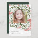 Fotokortet i elegant har ett favoritfoto omgivet av ett geometriskt gräns av botaniskt blad i lush grönt och små blommar av röda vattenfärger i blommor. Din anpassningsbar Julhälsningar och familjen namn eller namn visas vid grund i grått -bokstäver av chic. Anpassa baksidan med två extra foton och ett personligt meddelande mot bakgrund av en jägare-grönt.