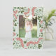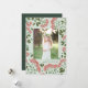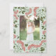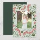 Fotokortet i elegant har ett favoritfoto som omges av en gräns av botaniskt löv i lush grönt och små blommar av röda vattenfärger på en grönt i chicen. Din anpassningsbar Julhälsningar och familjen namn eller namn visas under fotot med klassisk mjuk svart text.