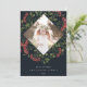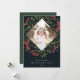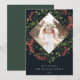 Fotokortet i elegant har ett favoritfoto omgivet av ett geometriskt gräns av botaniskt löv i lush grönt och små blommar av röda vattenfärger i blommor i riken. Din anpassningsbar Julhälsningar och familjen namn eller namn visas vid grund i chic med vita bokstäver. Anpassa baksidan med två extra foton och ett personligt meddelande mot bakgrund av en jägare-grönt.