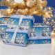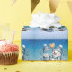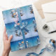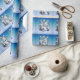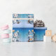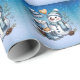 Charming winter illustration with a smiling snowman, striped scarf, blue mug of cocoa, boots and pine accents. Soft blue palette, warm accents, and cozy season feel!