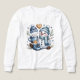 Charming winter illustration with a smiling snowman, striped scarf, blue mug of cocoa, boots and pine accents. Soft blue palette, warm accents, and cozy season feel!