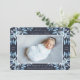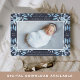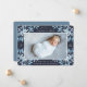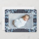 Elegantens botaniska födelsemeddelanden i chicens blå nyanser har ett enda vågrät eller ett landskapsinriktat foto med kluster av ömtåligt blått löv och vita bär i hörnen, mot bakgrund av rikens flotta. Anpassa till baby namn, födelsestatus och ett personligt meddelande, och lägg till ytterligare tre kvadratiska bilder på baksidan.