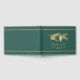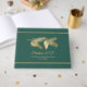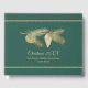 Elegant framträder grönt och helgdag gäst bok i guld, med grafik av guldkoner i gräs och gräs i gren. Anpassa texten fält till helgdag öppna hus eller till jul-party.