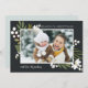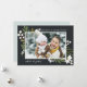 Med elegantens botaniska helgdag-fotokort placeras vågrät eller landskapets orienterade framsida och centrum, som accentueras av gröntens botaniska sprickor, blad, löv och vita liljor av dalen-blommorna, på en kontrasterande rikens svarta bakgrund. Lägg till din anpassningsbar jul hälsning (visas med "Season's Greetings"), och din familj namnteckning. En elegant och ett jakt helgdag-kort som säkert passar alla på din julkortslista den här säsongen!