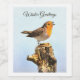 Winter Greetings text you can customize. Robin singing, on a small tree stump.