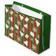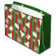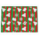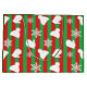 Julpåse med röd bakgrund och grönt, vita halvtoningar, hattar och snöflingor.