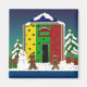 En design med ett färgat hus med smälter snö, pepparkaksgubbar och snögubbe.