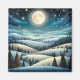 A serene winter landscape unfolds under the glow of a full moon, with rolling hills blanketed in snow and dotted with dark evergreen trees. Stars twinkle in the deep night sky, adding a magical touch to the peaceful scene. This fantasy landscape features a full moon illuminating a countryside covered in winter snow, with hills, trees and a star filled sky.