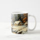 Two houses on a snowy morning, beside a river and sheltered by mountains, make a beautiful winter scene on this holiday mug.